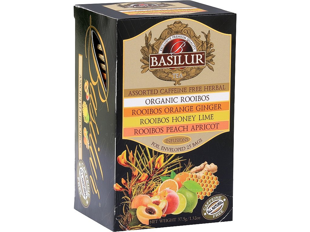 Složení: ROOIBOS - 100 % rooibos list, PEACH APRICOT - rooibos list 28 %, ibišek květ 17 %, šípek plod 15 %, heřmánek květ 16 %, citron list 18 %, aroma (broskev), HONEY LIME - rooibos list 32,2 %, pomeranč plod 30 %, citronová tráva list 17,5 %, citron plod 7 %, pomerančový květ 7 %, aroma (med, limeta), ORANGE GINGER - rooibos list 20 %, pomeranč list 20 %, zázvor kořen 10 %, citronová tráva list 35 %, pomeranč plod 10 %, aroma (pomeranč), kofein ne.