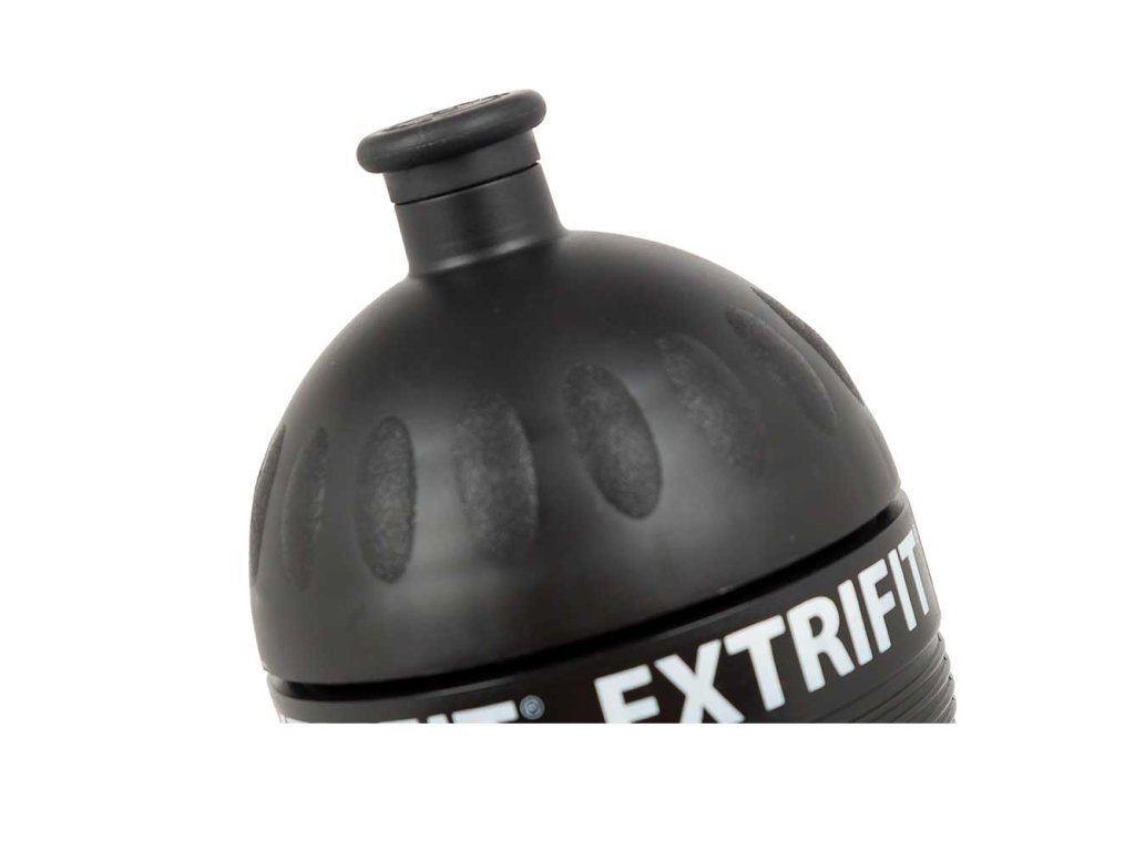Oranžové šroubovací víčko s černým posuvným náústkem či hubicí. Láhev je černé barvy, na sobě má loga Extrifit a nápisy produktů v oranžovo-bílém provedení.
