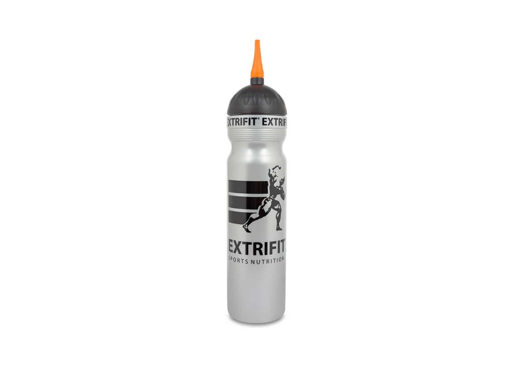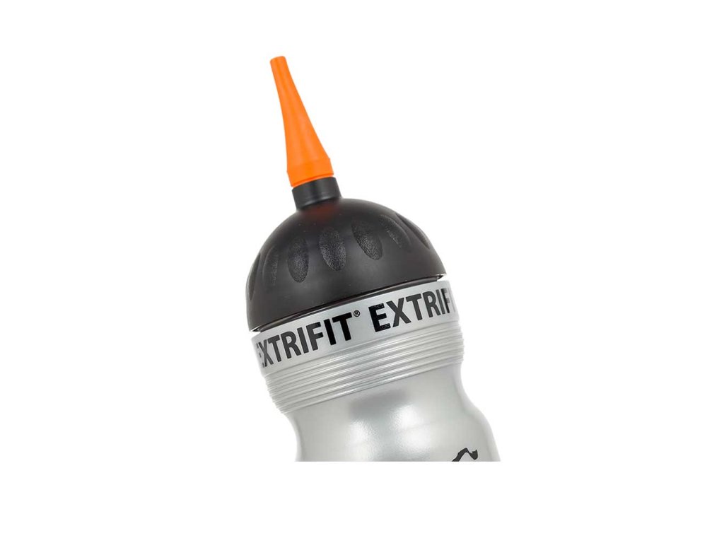 Oranžové šroubovací víčko s černým posuvným náústkem či hubicí. Láhev je černé barvy, na sobě má loga Extrifit a nápisy produktů v oranžovo-bílém provedení.