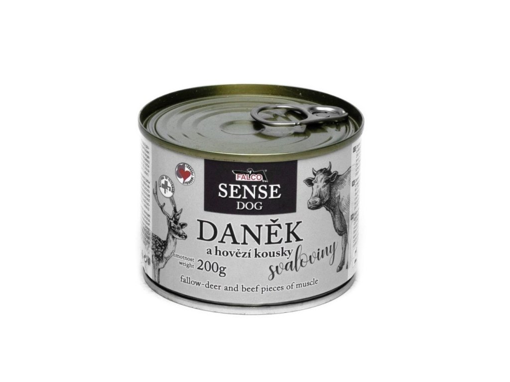 FALCO SENSE Dog daněk a hovězí kousky svaloviny, konzerva 200 g