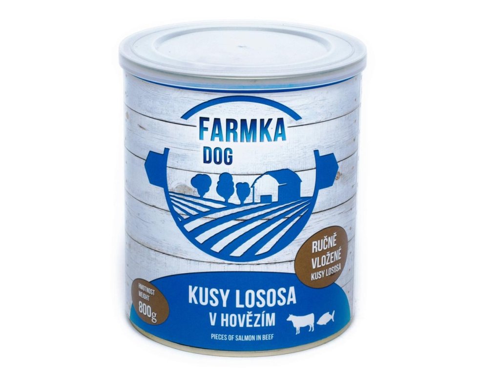 Ručně a poctivě vkládané kusy lososa v hovězím pro psy.
