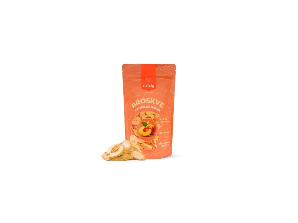 GRIZLY Broskve lyofilizované 50 g. Mrazem sušené broskve se vyplatí zařadit do svého jídelníčku. Jsou přímo ideální na přípravu svačiny, jelikož vyvolají pocit nasycení a přispějí k normálnímu trávení. Jestli vás baví zkoušet nové chutě, využijte lyo broskve při tvorbě domácích moučníků, přidejte je do granoly nebo pestrého smoothie. Čerstvou a křupavou chuť si díky tomu, že jsou baleny ve znovuuzavíratelném obalu, můžete vychutnat až do posledního sousta a pokud byste jich přeci jenom potřebovali víc, máme pro vás připravené XXL balení. Proč chtít GRIZLY lyo broskve. krásně křupavé 100% přírodní bez přidaného cukru díky lyofilizaci si zachovává svoji původní barvu, chuť i vůni lahodná svačina praktické znovu uzavíratelné balení Věděli jste, že…. …lyofilizace je proces sušení hlubokým mrazem za velmi nízké teploty a tlaku? Dochází k vysušení přirozeně obsažené vody, proto je lyofilizované ovoce tak křupavé. Navíc si v maximální možné míře zachová svou původní barvu, chuť, vůni a všechny minerální látky a vitamíny. GRIZLY TIP Plno zajímavostí o mrazem sušeném ovoci najdete v našem článku. Tak si ho neváhejte přečíst.Doplňkové parametry