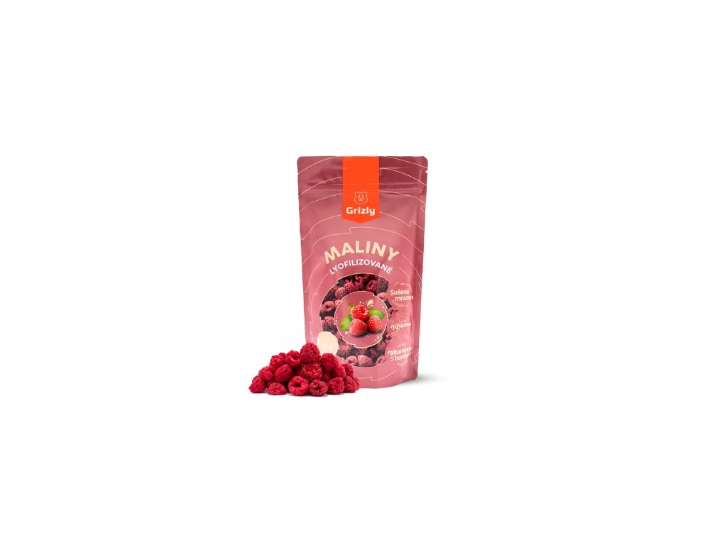GRIZLY Maliny lyofilizované 50 g. Kdo by neměl rád maliny?! Ty naše jsou díky sušení mrazem křupavé a zabalené v krásném obalu, který jde kdykoli otevřít a zase zavřít. Jakmile tedy dostanete chuť, stačí z něj vysypat hrst do misky a pustit se do mlsání. Lyo maliny se kromě mlsání hodí také do jogurtů, kaší, smoothie nebo proteinů, případně je můžete využít při pečení. Pokud byste jich měli málo, doporučujeme sáhnout po lyofilizovaných malinách v XXL balení. Proč chtít GRIZLY mrazem sušené maliny. neobsahují přidaný cukr šetrně sušeným mrazem zdroj vápníku Věděli jste, že…. …lyofilizace je proces sušení hlubokým mrazem za velmi nízké teploty a tlaku? Dochází k vysušení přirozeně obsažené vody, proto je lyofilizované ovoce tak křupavé. Navíc si v maximální možné míře zachová svou původní barvu, chuť, vůni a všechny minerální látky a vitamíny. Plno zajímavostí o mrazem sušeném ovoci najdete v našem článku. Tak si ho neváhejte přečíst.Doplňkové parametry