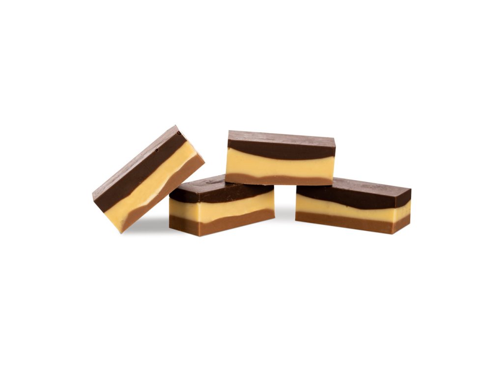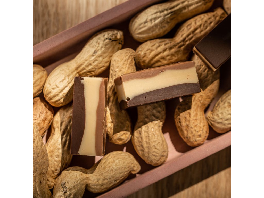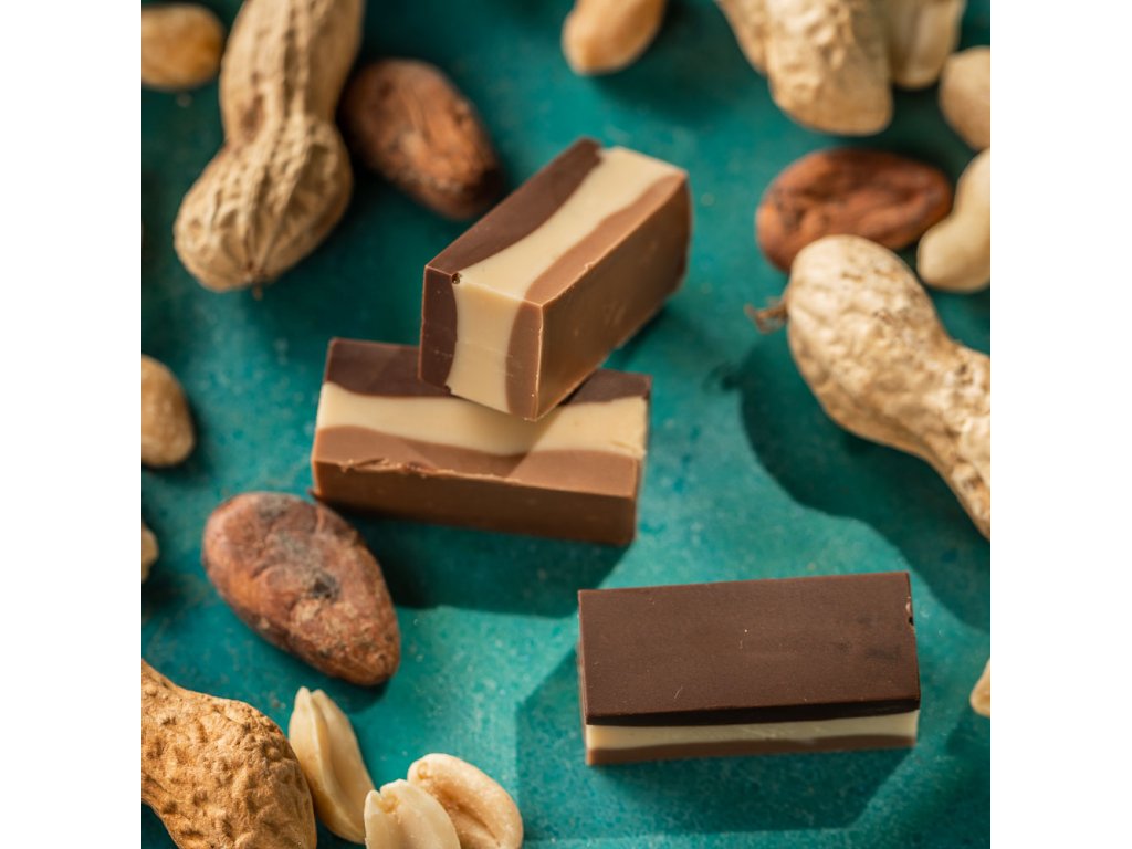 Složení: arašídy 50 % (rozmělněné), bílá čokoláda, mléčná čokoláda, hořká čokoláda (kakaová hmota, kakaové máslo, cukr, sušené mléko, přírodní vanilka, sójový lecitin)