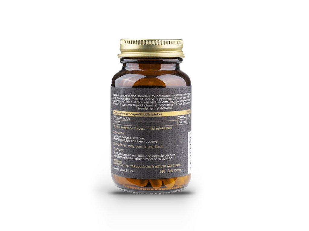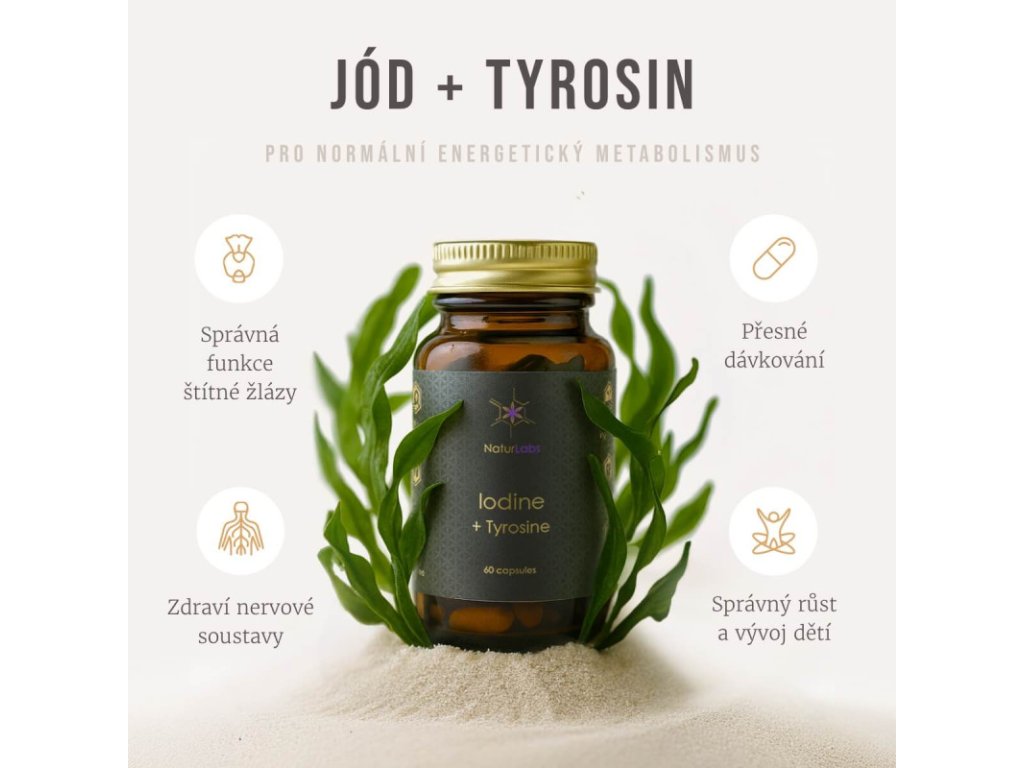 Jód je pro náš organismus jedním z nejdůležitějších minerálů. Označuje se doslova za klíčovou „potravu“ štítné žlázy, která prostřednictvím hormonů (tyroxinu a trijodthyroninu) reguluje spotřebu energie v těle. Při nedostatku jódu nemůže štítná žláza fungovat správně, a tím ani naše tělo. Přesto je v naší populaci běžné, že určité skupiny lidí nemají příjem jódu v běžné stravě dostatečně pokrytý.Pokud si chcete pomocí suplementace zajistit dostatek jódu, sáhněte po kvalitním doplňku Jód + Tyrosin, který kombinuje jodid draselný a L-tyrosin – aktivní látky nezbytné pro syntézu hormonů štítné žlázy. Oproti přirozeným zdrojům jódu, typicky z řas, Jód + Tyrosin v kapslích od NaturLabs zajišťuje zejména spolehlivost přesného dávkování.