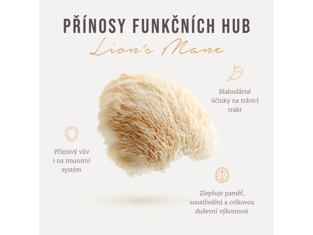 Lion’s Mane, podobně jako další funkční houby, obsahuje několik set biologicky aktivních látek, které mají velmi široké spektrum příznivých účinků na lidské tělo. Asi nejznámější z nich jsou betaglukany, které harmonizují náš imunitní systém.