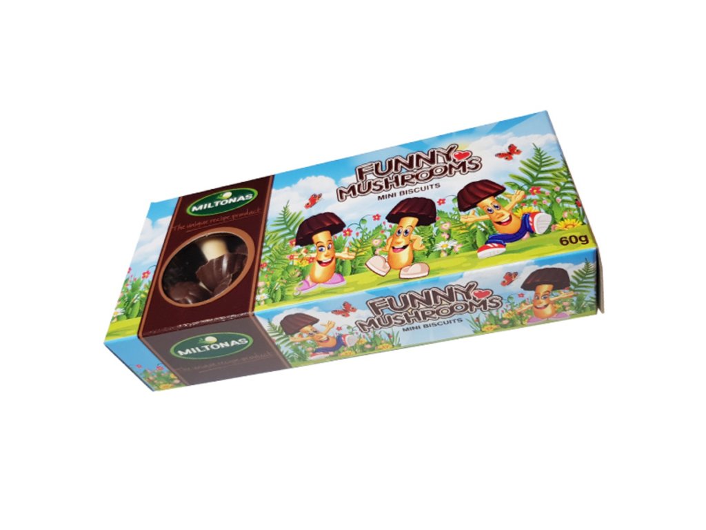 Miltonas Hříbečky mini z mléčné čokoládové polevy a sušenky 60 g Křupavá sušenka obelaná v mléčné čokoládě ve tvaru hříbku, to je skvělé mlsání pro malé i velké. Složení: Poleva 60 %: cukr, palmový tuk, emulgátor (tristearát sorbitolu E492), kakaový prášek se sníženým obsahem tuku, sušená syrovátka, emulgátor (řepkový lecitin), aromata (čokoládové, vanilkové); sušenka: pšeničná mouka, cukr, rostlinné tuky (z shea jader, palmový), voda, kokosový tuk, sušená syrovátka, sušený vaječný prášek, sůl, kypřící látky (uhličitan sodný, uhličitan amonný), invertní cukerný sirup, regulátory kyselosti (kyselina citrónová, uhličitan sodný), antioxidant (disiřičitan sodný). Může obsahovat stopy sóji, skořápkových plodů a sezamu. Skladování: Skladujte v temném, chladném a suchém místě. Miltonas Hříbečky mini z mléčné čokoládové polevy a sušenky, skvělá pochoutka ve tvaru hříbků.