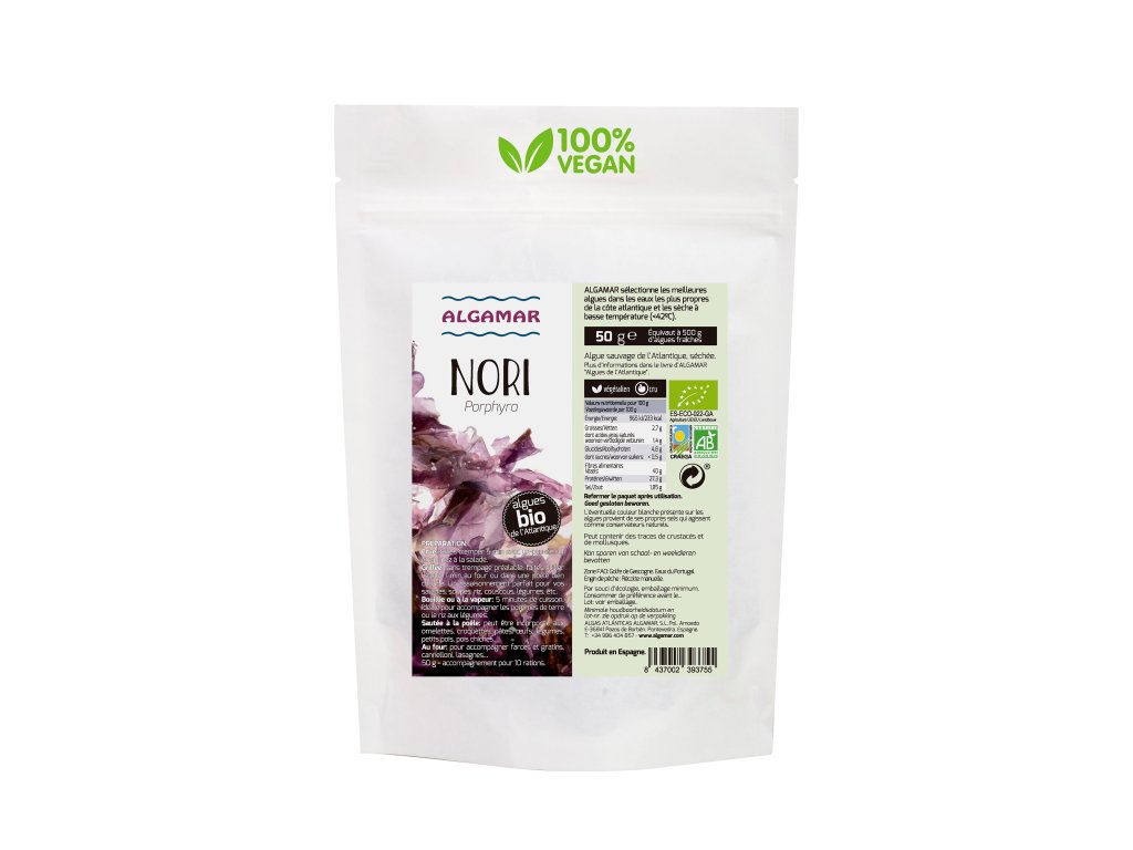Nori je nejrozšířenější mořská řasa především díky své výborné chuti. Řasy můžete jíst samotné nebo s nimi obohatit polévku či salát. Jsou přirozeně bezlepkové a vhodné pro vegetariány a vegany.