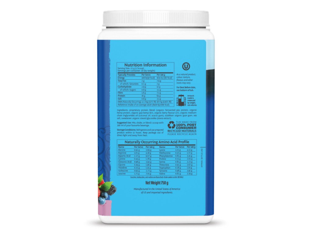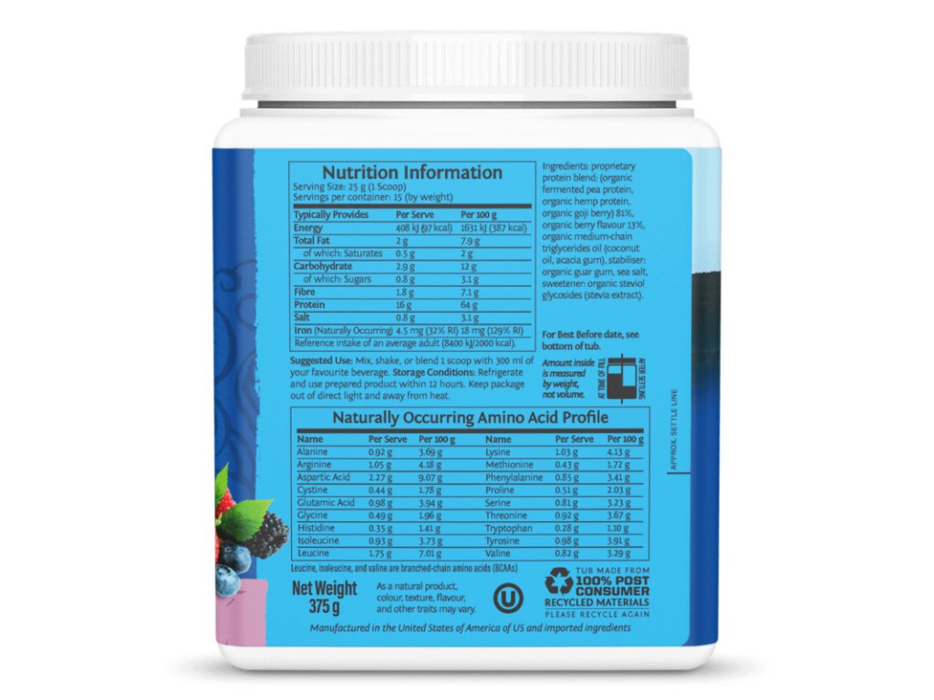 Složení: proteinová směs (hráškový protein*, konopný protein*, kustovnice čínská*), bobulové aroma, MCT olej* (kokosový olej, akáciová vláknina), guarová guma* mořská sůl, se sladidly z rostliny stévie (steviol glykosidy)*. *=BIO.