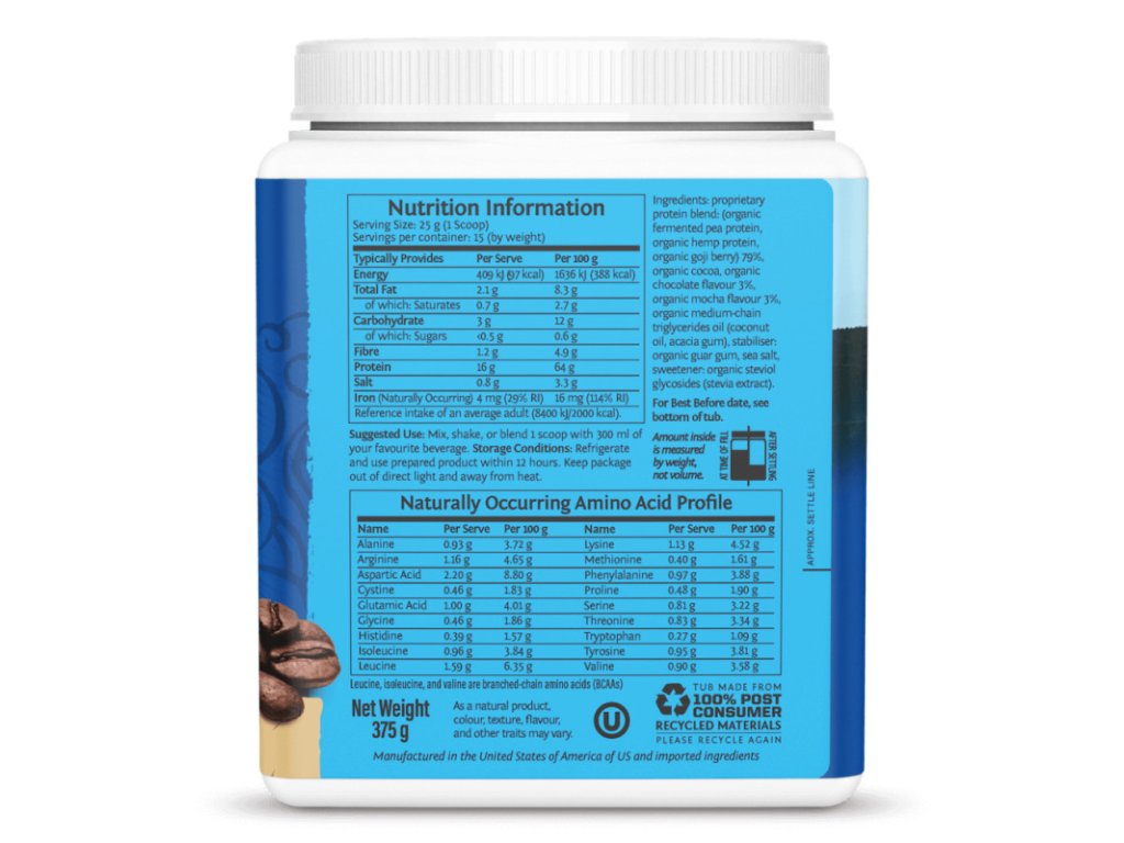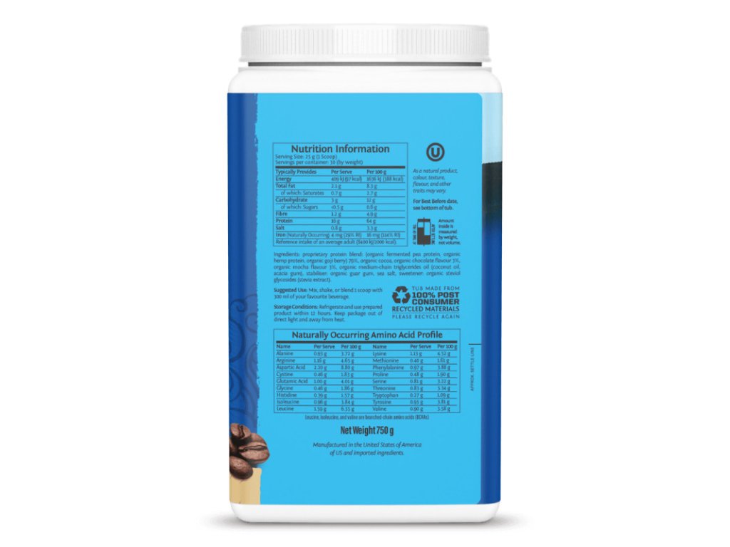 Složení: proteinová směs (hráškový protein*, konopný protein*, kustovnice čínská*), holandské kakao*, čokoládová příchuť*, moka příchuť*, MCT olej* (kokosový olej, akáciová vláknina), guarová guma* mořská sůl, se sladidly z rostliny stévie (steviol glykosidy)*. *=BIO