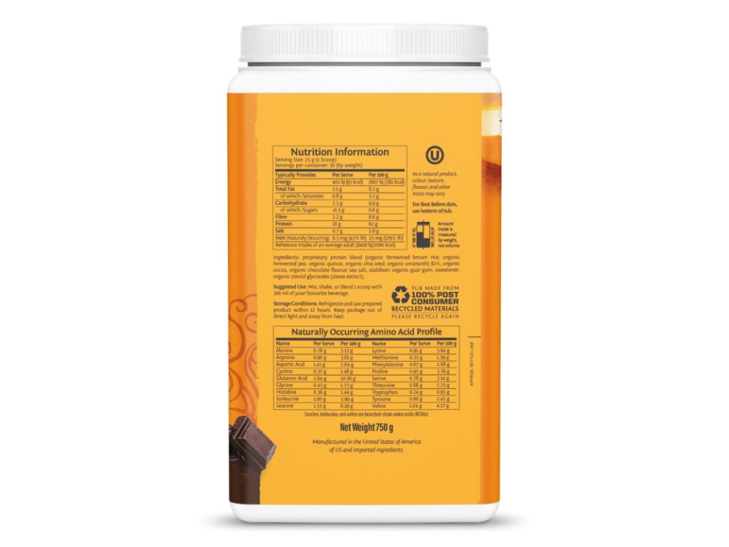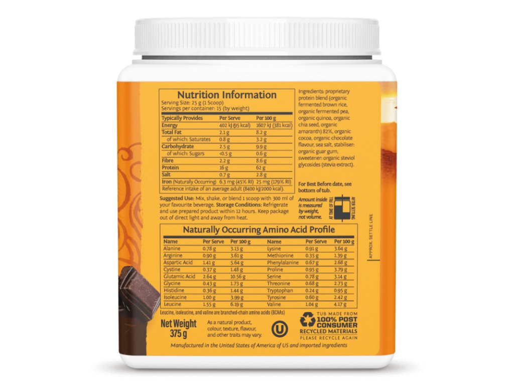 Složení: patentovaná proteinová směs (hnědá rýže*, hrášek*, quinoa*, chia semínka*, amarant*), kakao*, čokoládová příchuť*, mořská sůl, stabilizátor: guarová guma*, se steviolglykosidy z rostliny stévie*.