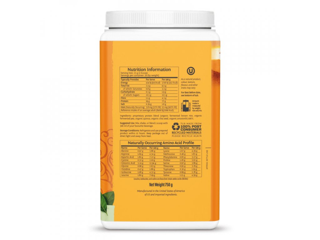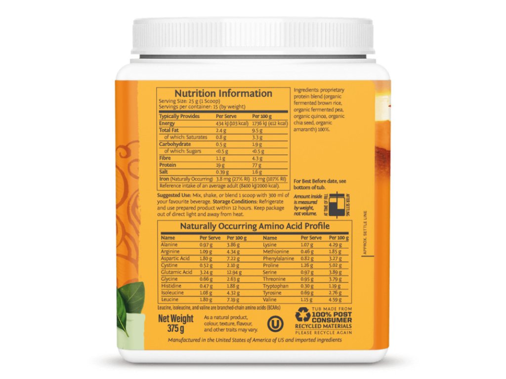 Složení: patentovaná proteinová směs (hnědá rýže*, hrášek*, quinoa*, chia semínka*, amarant*).