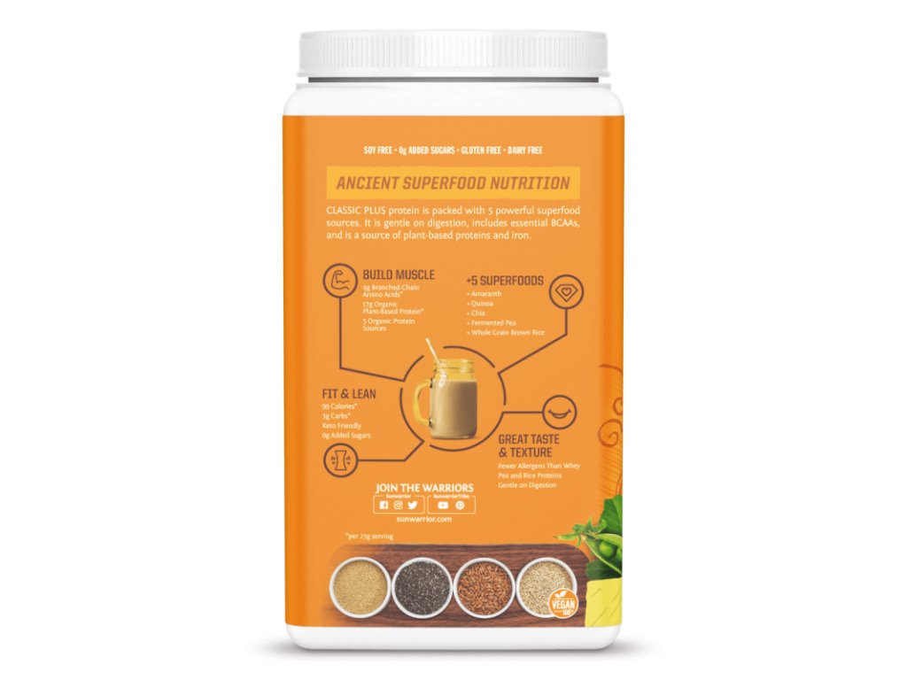 Protein Plus v bio kvalitě je postaven na originálním rýžovém proteinu Sunwarrior, a navíc obsahuje aminokyseliny z hrášku, chia semínek, quinoy a amarantu. Tato kombinace proteinů si stále zakládá na jemné povaze hnědé celozrnné rýže, ale navíc s řádnou dávkou síly, která učinila Warrior Plus tak populární. Hypoalergenní složení bez lepku a sóji zaručuje vysokou vstřebatelnost tohoto proteinu.Oproti běžným proteinům na bázi mléčné bílkoviny je tento protein lehce stravitelný. Díky tomu se po jeho konzumaci budete cítit dobře, bez trávicích obtíží.