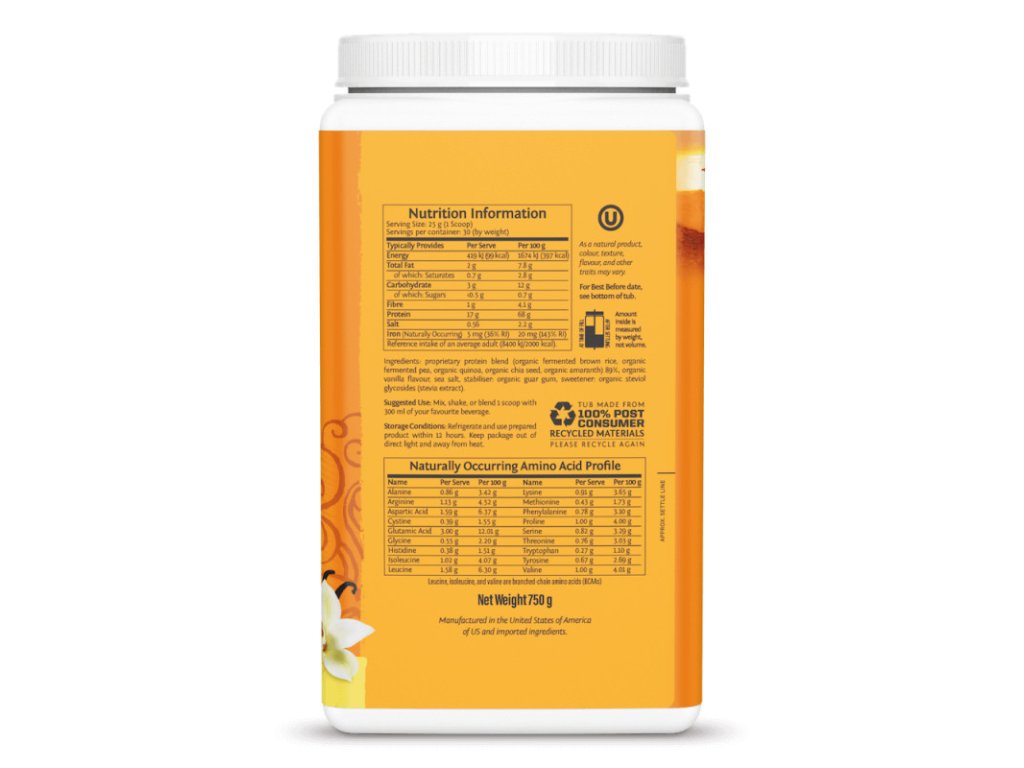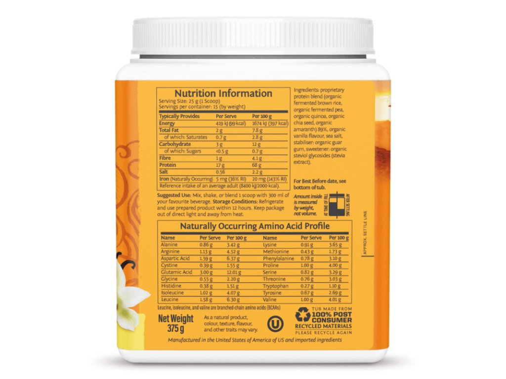 Složení: patentovaná proteinová směs (hnědá rýže*, hrášek*, quinoa*, chia semínka*, amarant*), vanilková příchuť*, mořská sůl, stabilizátor: guarová guma*, se steviolglykosidy z rostliny stévie*.