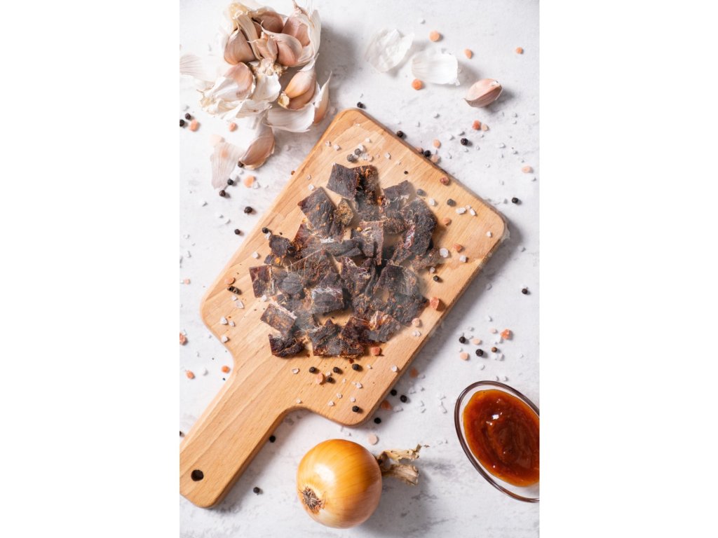 - Složení: hovězí maso, sójová omáčka (fermentovaná sója, fermentovaná pšenice (bez lepku), jedlá sůl, přírodní aroma), worchesterová omáčka (fermentovaná sója, fermentovaná pšenice (bez lepku), ocet, cukr, rajčatová šťáva z koncentrátu, jedlá sůl, jablečná šťáva z koncentrátu, přírodní aroma), cukr, hořčičné semeno, směs koření, rajčatový protlak.