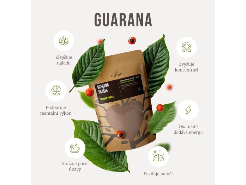 Chcete být výkonní, a přitom vaše tělo a mysl potřebuje dodat vzpruhu? Pokouší se o vás únava a vyčerpání? Guarana je tradiční přírodní životabudič, který vás nenechá na holičkách. Již amazonští indiáni věděli, že díky guaraně zvládnou v dobré kondici a s bystrými smysly extrémně náročné situace.Díky vysokému obsahu kofeinu je guarana nejúčinnější zbraní proti únavě. Dodává okamžitě energii a rapidně zvyšuje koncentraci. Posiluje paměť a zrychluje dobu vybavování, pozitivně tedy ovlivňuje i řečový projev. Stimuluje psychomotorickou aktivitu, zvyšuje pohotovost svalů a prodlužuje dobu potřebnou ke vzniku fyzického vyčerpání. Lehce snižuje vnímání bolesti a pocitu hladu. A k tomu všemu zlepšuje náladu!