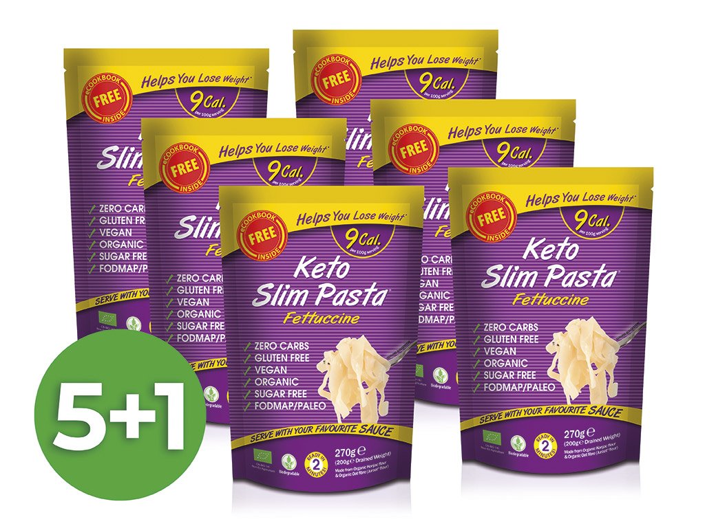 Zamilovali jste si konjakové fettuccine a máte pocit, že jich není nikdy dost? Dopřejte si tento zvýhodněný balíček 6 kusů a zajistěte si zásoby. Konjakové fettuccine Slim Pasta jsou veganské, bezlepkové, zcela bez sacharidů, mají pouhých 9 kcal na 100 g a obsahují vysoký podíl vlákniny glukomannan. Perfektně se hodí pro low carb stravování, ketodietu, odlehčení jídelníčku či aktivní sportovce.Slim Pasta fettuccine BIO v nálevu jsou nízkokalorická konjaková příloha. Mají až o 94 % méně kalorií než běžné fettuccine a neobsahují žádné sacharidy. Jsou vyrobené spojením bio bezlepkové ovesné vlákniny a bio konjakové mouky.